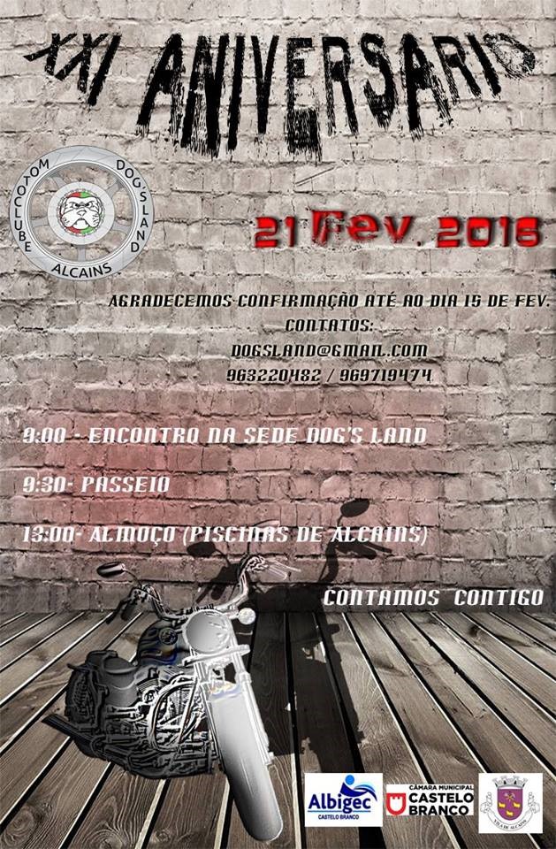O MotoClube de Alcains - Dog's Land comemora o seu 21º aniversário no próximo domingo, dia 21 de Fevereiro de 2016.