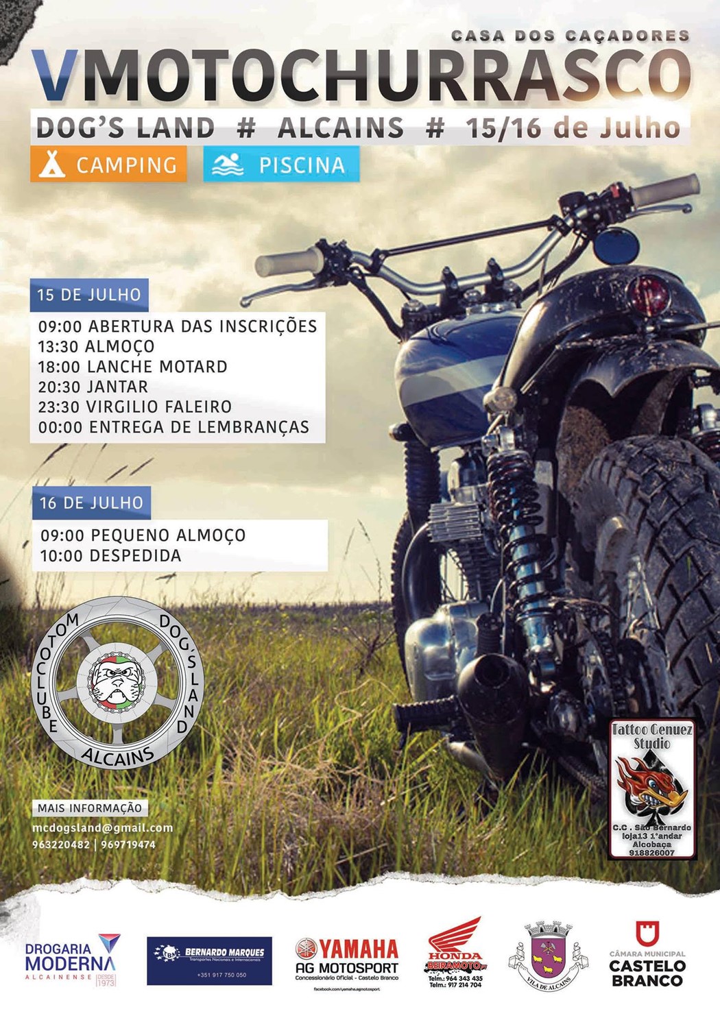 O Moto Clube de Alcains "Dog's Land" organiza o seu V Motochurrasco nos próximos dias 15 e 16 de julho na Casa dos Caçadores de Alcains.