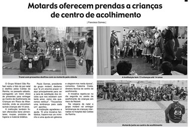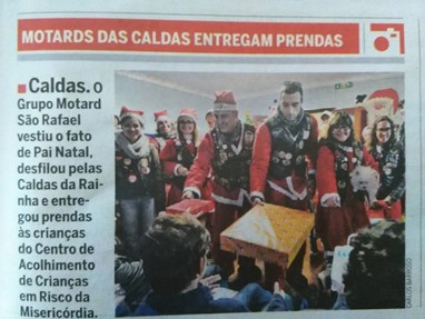 No dia 21 de Dezembro decorreu um passeio de "PAIS NATAIS MOTARD" com passagem pela estrada atlântica (Caldas da Rainha - Foz do Arelho - Nazaré), que terminou com a entrega dos bens angariados ao Centro de Acolhimento de Crianças em Risco de Nazaré (Confraria de N.ª Sr.ª Nazaré). Neste local foi possível dar uma alegria adicional às crianças com um “Carrossel” de Motas, em que as crianças tiveram a oportunidade de fazer uma pequena viagem com as motas dos “Pais Natais”.