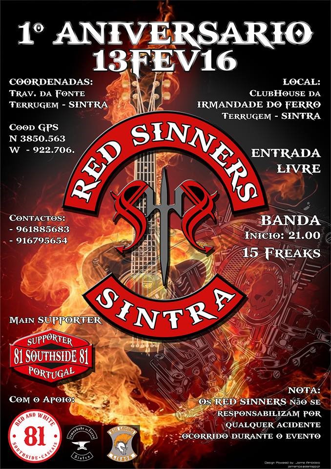 Os Red Sinners Sintra comemoram o seu 1º aniversário no próximo sábado, dia 13 de Fevereiro, na ClubHouse da Irmandade do Ferro em Terrugem - Sintra, a partir das 16h00. A entrada é livre.