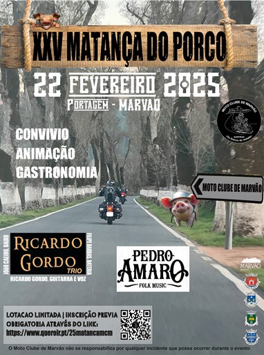 Juntem-se a nós na XXV Matança do Porco e venham disfrutar de uma tradição Alentejana, onde o convívio e a excelente gastronomia tradicional são as principais atrações... na viagem não se esqueçam de disfrutar das esplendidas paisagens e curvas que toda esta região tem para oferecer.