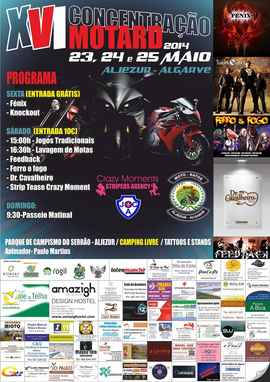 No próximo fim-de-semana, dias 23, 24 e 25 de Maio de 2014, realiza-se a XVI Concentração Motard de Aljezur, organizada pelos MOTO-RATOS (secção de Motociclismo do Juventude Clube Aljezurense) no Parque de Campismo do Serrão.