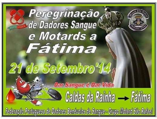 O Grupo Motard São Rafael vai organizar no próximo dia 21 de Setembro de 2014 uma peregrinação de dadores de sangue e motards ao Santuário de Nossa Senhora de Fátima.